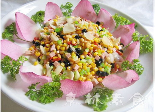 (8)另起锅,锅中加入少许水,分别将粟米粒、黑珍珠粒、百合、素火腿粒、西兰花茎粒,一同倒入调味打芡,再将枸杞子、松仁放入,翻炒一下,最后淋上香油出锅,将先准备好的,用荷花瓣围边好圆盘,将菜慢慢的放在花瓣中间即成。