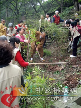 清明前后正是万物萌苏的季节。三月十九日,重庆磁器口宝轮寺僧人及佛教信众志愿者一行三十多人,肩荷植树造林工具-----锄头,铁锹等,在宝轮寺住持风轮法师带领下,来到近郊的平顶山文化公园植树造林。给无声的有情一个佛教徒的慈悲大爱。