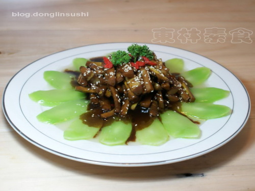想要舒舒坦坦地品味油焖笋还是自己做最来得开心,溜达到菜场去,挑个个头大的“黄芽头”春笋,去壳剥衣,将笋切成条状,锅内倒入植物油烧热,将笋过油,倒出沥干油,然后放酱油(我的酱油特别李锦记的蒸鱼豉油绝对的素)糖、盐、素易鲜(我改良品种放了点干辣椒)最后加入水,烧沸后改用文火焖45分钟,再转旺火将汤汁浓缩,可以勾一点点薄薄的芡淋少许麻油即可。为了提升油焖笋色彩,我加了另一个春季的菜莴笋,给大家有视觉上的享受,菜是一门色彩的艺术,它和时装有相似的地方,都讲究色彩的搭配和点缀。