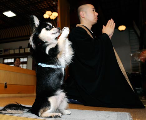日本小狗皈依佛门 爪子相扣朝拜佛像