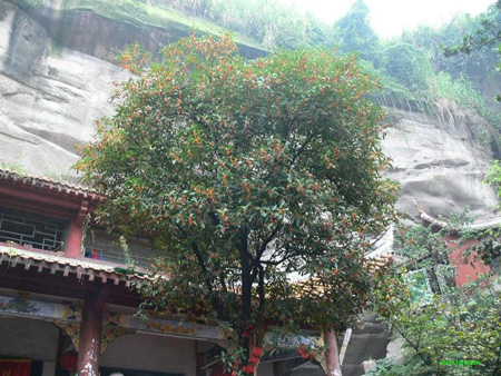 近日,重庆华岩寺华岩古洞金桂“朱砂红”花开数日后,华岩寺罗汉堂前二棵极品银桂“九龙桂”又争相妍放。