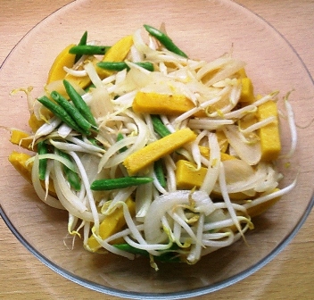 将南瓜糕放凉后切成细条,备用。热油锅翻炒洋葱,豆芽和长豆角至6分熟,倒入南瓜糕条再一起翻炒,加盐入味即成。