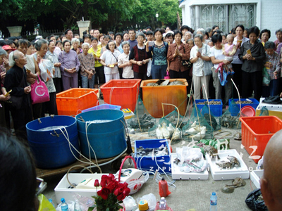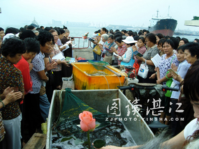 农历十月初八是全国放生日,为推动保护湛江海的生态平衡,促进环境保护,祷求平安长寿。当日我市有上千位老人家涌跃自愿捐款购买乌龟、蟮、鳖、白鸽等野生动物,在霞山海滨码头举办放生仪式。