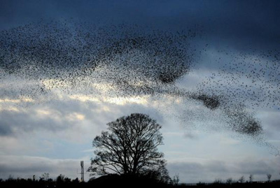 这些鸟儿看起来象在执行“神风”任务,它们的飞行逻辑使得队形妙不可言。每年冬天,星椋鸟会在附近的芦苇荡中觅食,一天活动之后,它们就会飞上天空。结伴飞行在夕阳的余晖中,在领头鸟的带领下快速而聚集飞行。