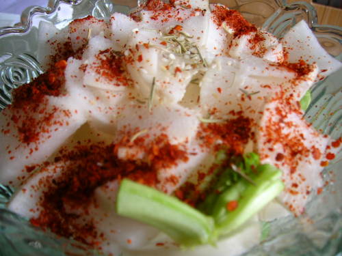 2/ 放入食盐、辣椒粉、冰糖适量,再加入2汤匙白醋,3汤匙凉白开。