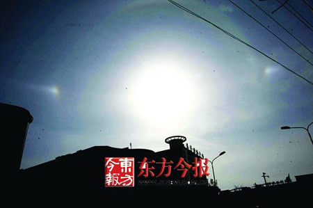 据当地气象专家解释,这两个“太阳”是薄云天气下的光折射产生的虚像,即所谓的“假日”,这种天象十分罕见。