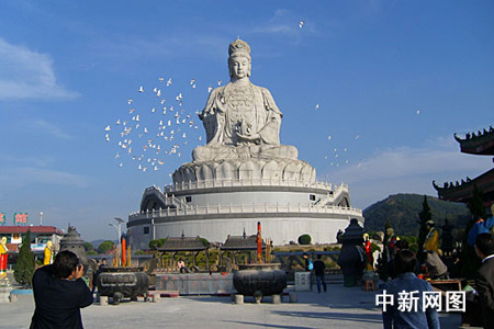 记者从广东东莞观音山国家森林公园内了解到,近日,一群约二百多只的鸽子在该公园的观音广场上,时常围绕着三十三米高的世界上最大的花岗岩观世音雕像飞舞。