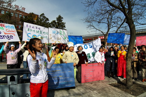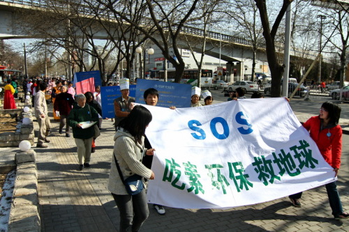 许多大学生们自愿加入举环保大旗和活动标牌队列,走上街头向市民展示素食对于环境的重要性!他们也做出幽默的动作表示对素食环保事业的支持!