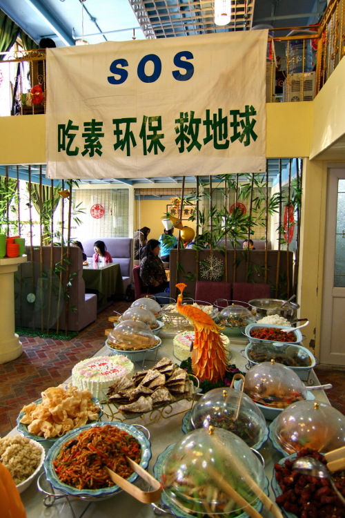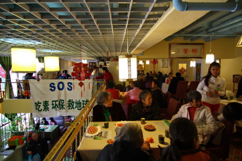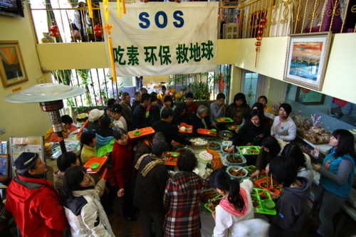 志愿者们12点钟在北京彼岸爱之素餐厅举行体验素食的自助餐活动,大约100多名体验素食的志愿者齐聚一堂,餐厅里面高高悬挂着——开始吃素,加入环保,拯救地球大旗。餐厅里面座无虚席,连平时喝茶的主桌都满客,还有人站着用餐等待加入活动,可见志愿者们对于素食环保事业的热情和行动的决心。