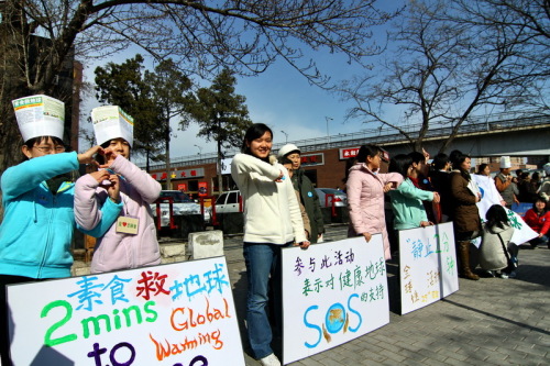 09年2月22日,由全球素食环保志愿者发起的,在世界25+个国家同时举行2 Mins to change 2 分钟“固定不动”活动即素食环保志愿者在指定的2分钟内同时静止不动,摆出不同的姿势以吸引路人,引起大家关注环保,参加吃素的行列,拯救地球——我们可爱的家园。今天,很多素食志愿者聚集北京爱之素素食餐厅,在用完美味可口的自助餐后,走上街头,加入这一伟大的历史性时刻!
