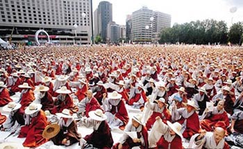佛教信徒和僧侣们高举李明博总统下野、鱼清秀警察厅长下台等标语,举行了声讨现政府宗教偏向的泛佛教徒游行大会。
