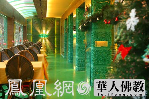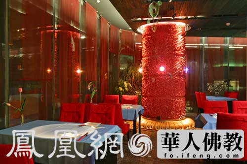 在这里,人们不仅可以享受到新鲜可口的美食,还可以欣赏一道道令人惊叹的艺术风景线。六块绚丽的蔚蓝色玻璃壁画顶天立地,以北魏风格绘制的六位菩萨神态各异,身姿婀娜地迎接着人们的注目;正门入口处是一幅生动的九色鹿浮雕,取材于著名的敦煌经变;特别订制的水泥砖地面上,清晰可辩二首意境清新高远的禅诗;吧台的背景墙面是代表荷塘月色统一风格的设计组合。中间是一轮光芒四射的满月,两侧有八块张大千手绘神采飞扬的飞天玻璃浮雕;吧台上方吊顶采用自在手印图案,宣示着一种解脱精神心灵的超越与文化的包容;纯木制的天花吊顶借鉴了西方教堂建筑注重心灵关怀的设计理念,以光线与色彩的巧妙运用,营造出使人身心放松,豁然开朗的自由空间;在富于文化内涵的地面与自由开朗的天花板之间,是古拙厚重的中心立柱,金色的莲花底座托起造型别致新颖的柱体,四盏明莹的壁灯仿佛空中天女随手洒落的花瓣;造型简约,风格浪漫的餐桌上,一束兰花柔缓地绽放;从玻璃幕墙上垂挂下的酒红色窗纱跳跃出灵动和谐的音乐节拍,与窗外夕阳下教堂传送的晚钟宫商酬唱,演绎着传承远古精神、融合东西文化的经典乐章。