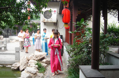 一进门,阵阵梵音和袅袅檀香扑面而来,明亮的玻璃,淡淡的紫色纱幔,深紫色台布,宽大的桌子,明媚的阳光照在上面,轻柔如天籁般的佛教音乐在耳边萦绕。书架上摆放着佛经,可供食客在无聊等候的时候取阅。店中不供应白酒,因此听不到普通饭店里吆五喝六的嘈杂,食客大多也是低声细语交谈,到“纳地”就餐,品的就是这份素静的休闲方式。在这里,精致到每个的细节,包括那些漂亮的餐具,还有桌上的小摆件,都是“神仙妹妹”亲手淘来并布置的。泡一壶“纳地特调茶”,欣赏着柠檬片、洛神花和玫瑰蕾在水里慢慢绽开,配上冰糖,味道又酸又甜,非常适合餐前开胃。点菜是一种乐趣,因为“纳地素食”的菜品都是素制的,即便它做成了肉食的模样,而且多数都取了很别致的名字,“如意佛手卷”、“水煮三国”、“纤纤玉笋”、“山竺法会”等等,从这美丽的名字中你能猜出到底是什么菜吗?