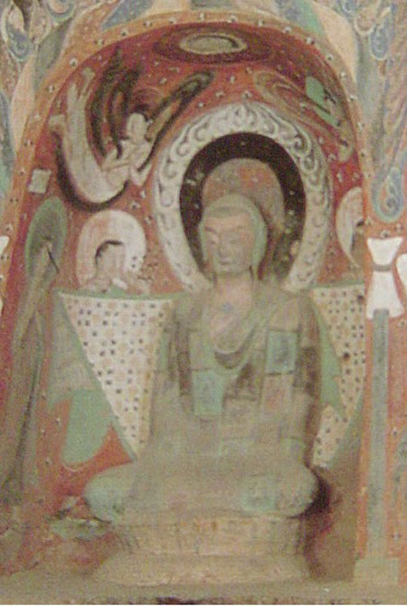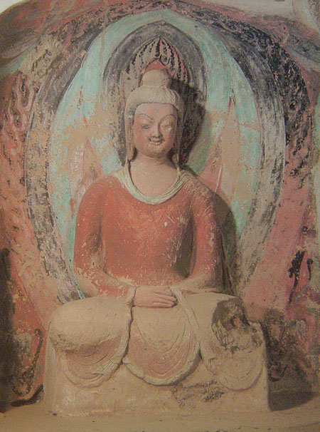 第259窟坐佛 塑造于北魏,位于该窟内北壁下层龛由里向外数第三龛内,眼睛和左腿已略有破损。坐佛高