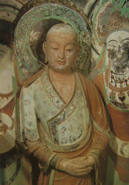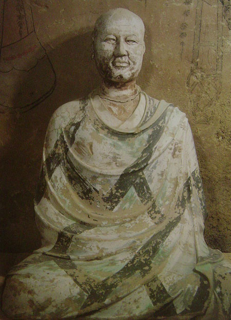 第285窟禅僧 塑造于538~539年前后。为一青年静坐的禅僧形象,其双手作禅定状,身穿水田袈裟,色彩明快,裹头缠身,头微微下俯,双目凝视空茫,双唇轻合,静神沉思。底色为土红色,头光为红色和白色火焰组成的圆形,后有装饰着小花的白色三角靠背,三者将禅僧坐禅时的宁静衬托的更为突出。虽身着袈裟,却依然隐现出禅僧圆润的肌体,表现出了静从习定的禅僧充满着生命力却又心如止水,不染尘埃。从整体造型上看,上实而下虚,塑造者更注意对头部的刻画。所以塑像的面部显得犹为细腻,红润的肌肤、饱满的天庭、清秀的眉目、耸直的鼻梁、略方的口唇,使僧人在清秀俊逸的面相中透露着颖悟睿智、潜心参禅、不染尘世的意境。