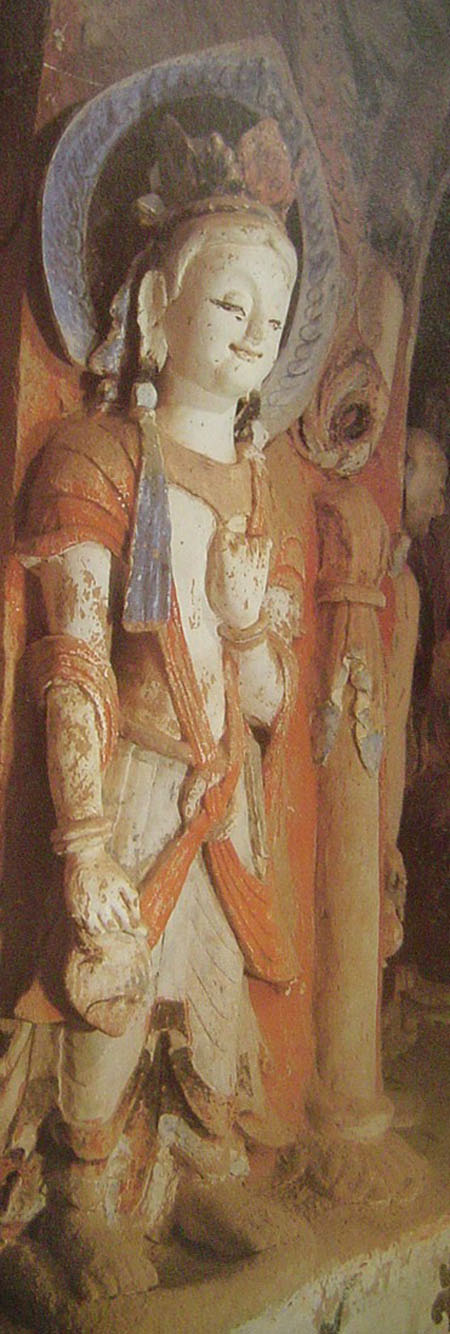 第290窟菩萨 塑造于北周,位于中心塔柱南向龛外两侧,保存完好。塑像头上戴花蔓宝冠,冠帻长至披肩,身上饰有长带,肩上披着质地厚重的大巾,一手贴在胸前;面貌清秀,皮肤白皙,双眼微微眯缝,鼻子小巧的耸起,嘴角略上翘含着笑意,仿佛一个纯洁、天真、带着几分稚气的少女。其身后青色的头光与肩上红色的披巾将脸庞烘托的更为温柔可爱,是北周彩塑的一身精品。