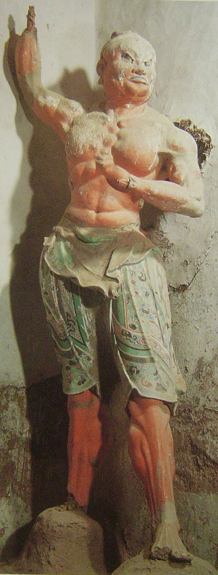 第194窟力士 塑造于盛唐,位于主室正龛外的南北两侧。两身塑像均头束发髻,上身赤膊而立,腰上围有短裙,脚下踏着金刚山。站在南侧者昂首挺胸,横眉怒目,紧闭嘴唇,举臂抬肘,肌肤呈红色,显现出颇为凶猛蛮横的性情;北侧的力士正挥舞拳头,推动手掌,竖立眉毛,瞪大双眼,张嘴似乎想要怒吼,却似怒又笑,其肌肤呈白色,威武豪迈之性格自然流露。在人物的造型上,塑造者注意了头、胸、下肢三段动作的变化,以肌肉和筋脉的突起和紧张来表现力士正向外迸发的无尽力量。整体形象上有一种强烈的韵律和节奏,把力士力大无穷、气拔山河的精神风貌刻画的淋漓尽致。此外在上色时还运用了晕染的技法,随人体结构的起伏,以略深的颜色染凹陷处,突击肌肉的阴阳明暗,以增强其立体感和真实感。