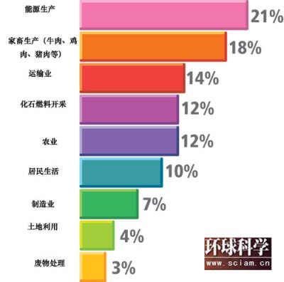 我们都知道轿车、燃煤发电厂,甚至水泥厂对环境的负面影响,但直到不久以前,才开始关注食品的环境危害。联合国粮农组织(FAO)2006年发布的一项报告表明,我们的日常饮食,特别是肉类,向大气排放的二氧化碳、甲烷、氮氧化物等温室气体,比运输业或工业还多(温室气体吸收太阳能,使地球表面变热。各种温室气体效应强度不同,它们使地球变暖的效应通常用二氧化碳当量来表示,也就是将它们换算成具有相同效应的二氧化碳量)。