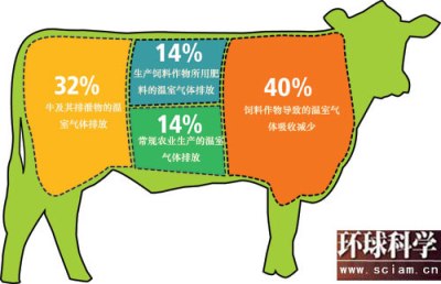 牛肉产生温室效应的最主要原因是,吸收二氧化碳的树木、草地和其他所念生植物的消失——这些土地改为种植饲料作物,且每年都要收割;其次,是因为动物排泄物和动物消化饲料时排放的甲烷。