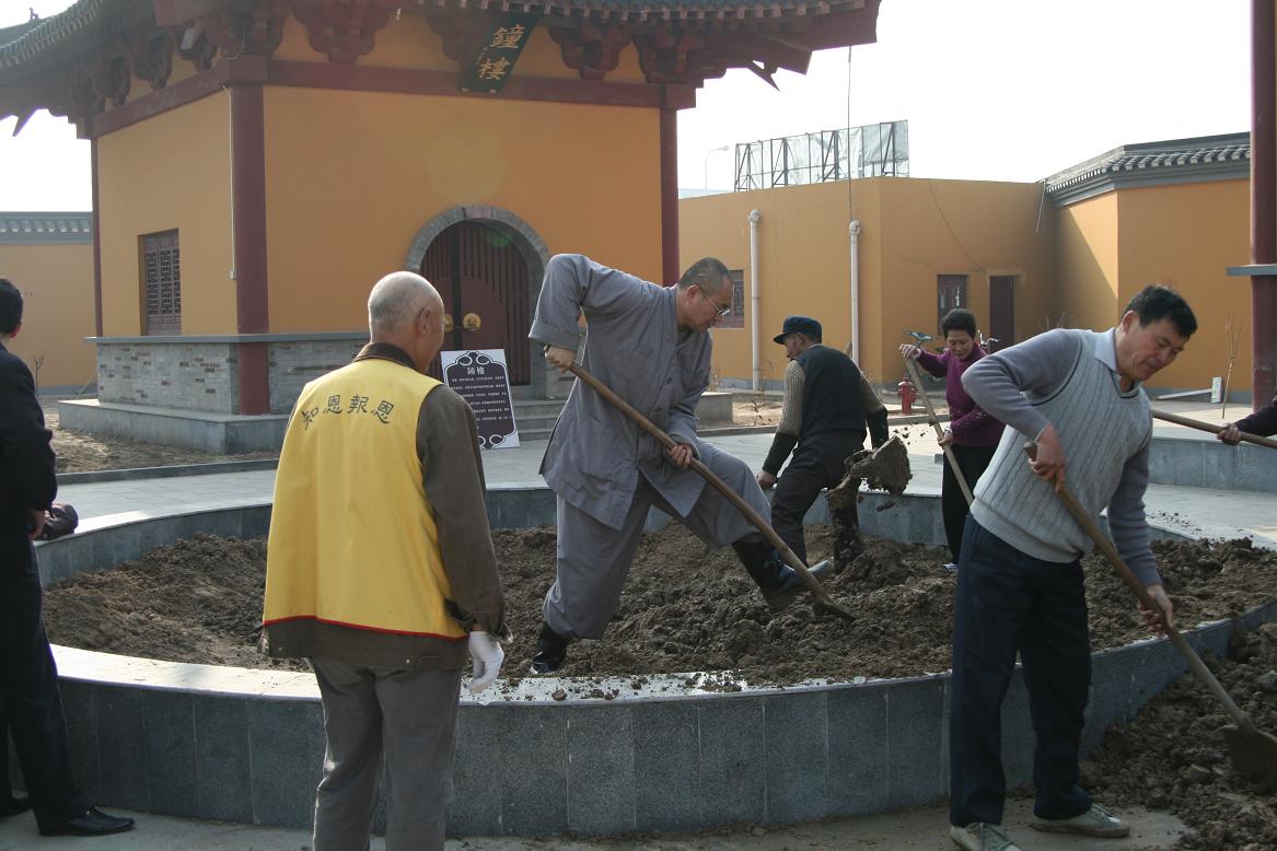 阳春三月,万物复苏,春意盎然,恰是植树的好时机。为了绿化寺院,改善环境,迎接寺院落成大典,江苏省涟水能仁寺僧众居士,在住持曙正法师的精心策划和带领下,把握时机,日夜奋战,不怕脏,不怕累,人拉车载,运土、移木、挖坑、填土、浇水,连八十多岁的老居士个个都忙得汗流浃背,不亦乐乎。短短几天时间,就从远地运进新土上千方,栽树300余棵,为复建后的能仁寺带来了一片生机。