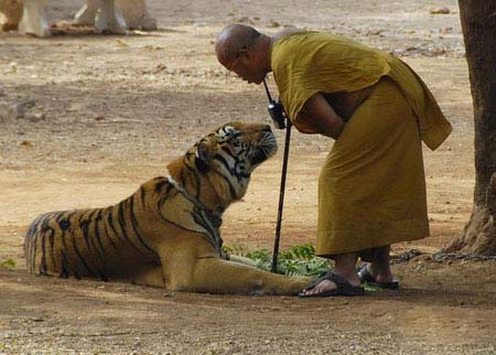 令人放心的是,这些老虎是依照佛教禁止暴力的教义抚养长大的。如果老虎出现暴怒行为,比如咆哮和挥爪,将会被从塑料瓶子里喷出的水惩罚。对老虎的刺激也被最小化———当山羊或者母牛等经过时,僧人们会蒙上老虎的眼睛。