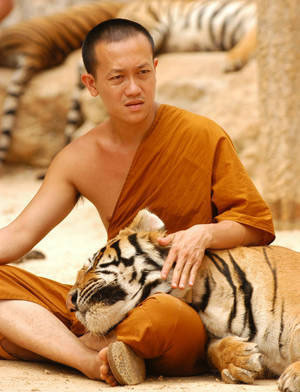 老虎寺位于曼谷西面约200公里,僧人和17只老虎一起生活。尽管它们拥有惹人喜爱的名字,比如“阳光”、“早晨的天空”、“彩虹”,但仍然令人生畏。