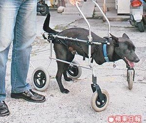 台北市刘姓妇人得知后,捐出一部市价2万元新台币的美国制狗轮椅,“暴龙”昨由兽医师装上轮椅,重获行动自由,兴奋得四处乱跑。