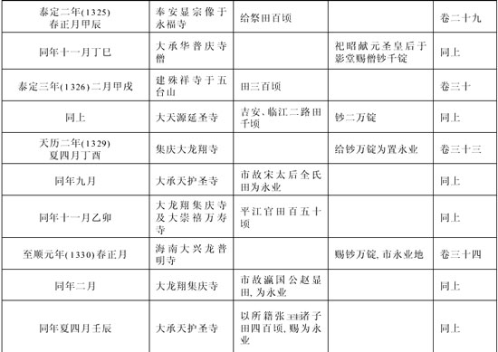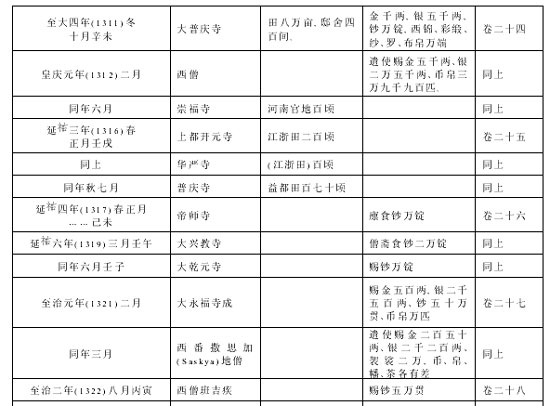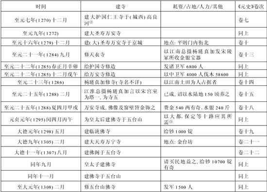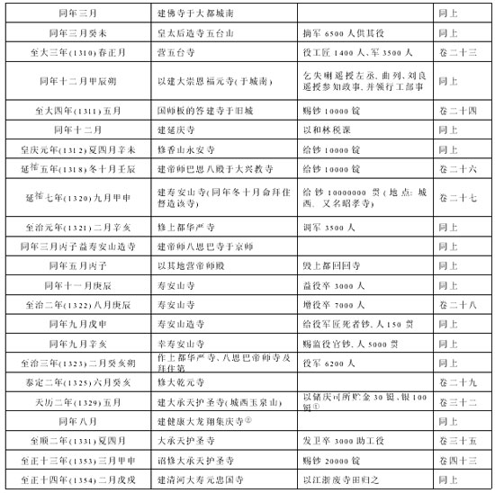谁都不会怀疑,上表所列只能是元代建寺的一部分而已,其中只有一些明确记载花了多少钱财、物资和人力的数目,总计先后调用了各种军士32000人、工匠1400人、役卒卫卒13000人,耗金30铤又540两以上、银100铤、水银240斤、钞10000000贯又51700锭;而许多并没有注明详情,其占用了多少土地,耗用了多少人力和资产,我们无从确知,而这些缺载的大多是像大护国仁王寺、大崇恩福元寺、大乾元寺、大龙翔集庆寺(南京)之类极其重要的寺庙,所耗还会比有记载的寺庙少吗?有些即便有所说明也难以具体量化,比如至元二十一年(1284)九月以江南总摄西僧杨琏真加发宋陵冢所收金银宝器建天衣寺,而这些金银宝器究竟是多少,只有去想象了,反正怎么想象杨琏真加所盗墓宝也不过分!有些只记载了半截,比如至治元年(1321)十一月“益( 增加)