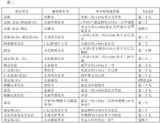 而实际上据《元史》所载,佛事最多时(大德七年)达五百余种!凡大婚、出行,凡百兴作,无不受戒,亦无不作好事。凡祈雨、祈风、止雨、镇雷、荣星、修疫、超度等,均须番僧佛事祈祷。凡帝后驾崩,佛事斋僧既竣,乃奉祀御容于喇嘛寺,塑影堂为祀。据《元史·祭祀志》载,各位帝后之影堂并非一处,往往各据一寺:“影堂所在,世祖帝后在大圣寿万安寺,裕宗帝后亦在焉。睿宗帝后大普庆寺,仁宗帝后亦在焉。成宗帝后大天寿万安寺。武宗及二后大崇恩福元寺为东西二殿。明宗帝后大天源延寿寺。英宗帝后大永福寺。伊克皇后大护国仁王寺。”据此,我们再结合《元史·本纪》所载列表如下,可知蒙古及元代帝后御容影殿之一斑(见表二)。