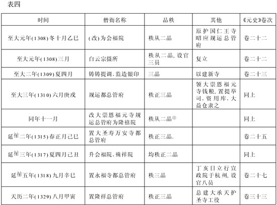 建寺劳民伤财,这还不够,为了建寺,朝廷不时要建立许多僧司管理工役,建成后要设衙门管理寺院赀产等事务,这些衙门都是要吃皇粮的,皇粮当然是从老百姓那里收括,而这些衙门的品秩有的相当高,据对《元史》的不完全统计,其中三品以上就有如下(见表四)。