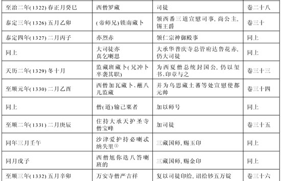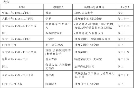 实际上,除了帝师名号之外,元廷还赐予了许多重要僧人(主要是藏传佛教僧人)各种各样的名号,比如“(释教)总统”、“司徒”、“(三藏)国师”、“法主(宗主)”以及各种各样的“国公”等等。像“帝师”一样,这些名号实际上也是官爵,因为它们赋有各种各样的特权。而好些已有僧人名号的,还会“因帝师请”等原因加封官爵。本文根据《元史·本纪》所载有限的资料,将元代对僧人赐号加爵的简况表列如下(见表六)。