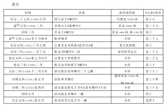 写经之频繁、形式之多样,那就更是情理之中了。我们依然只据《元史·本纪》作一简单翻检,就发现了如下许多(见表五)。