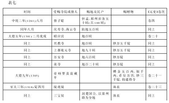 正如上文所说,元代僧司衙门之多,僧人名爵之繁,是我们今天难以彻底说清的,因为史载并非历史事实之全部。但有一点可以肯定,元代以藏传佛教僧人为主的享有各种名爵的僧人,都有不同的等级次第,享有不同的特殊待遇,即官俸。然而,除此而外,诸僧乃至诸寺多有频繁的赏赐,大量田土变为寺产,大量财物落入寺门或僧人私囊(见表七)。