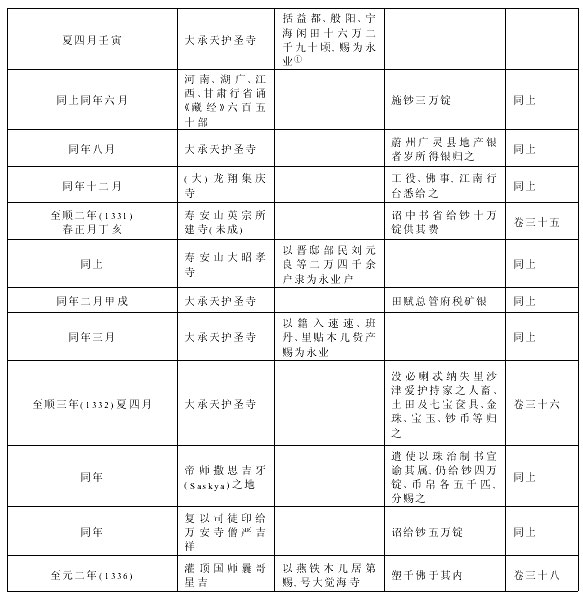赏赐土地是蒙古封建分封制遗风的延续,那么,以民户赐为所谓“永业户”则是封建农奴制的翻版了。我们相信上表所列至顺二年(1331)正月以晋邸部民刘元良等二万四千余户隶寿安山大昭孝寺为永业户只是这种翻版之一项而已!
