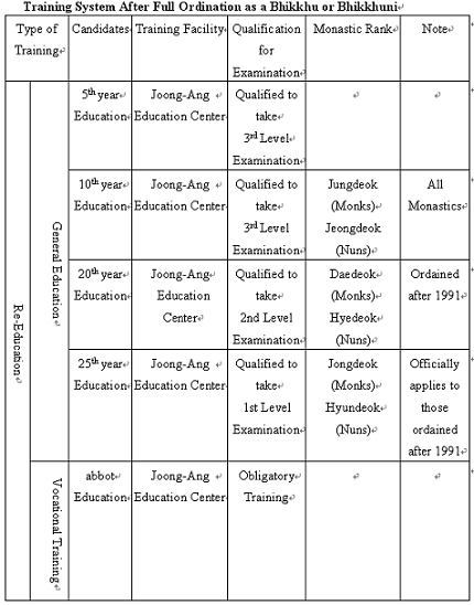 According to the ordination age, the Jogye Order monastic must complete the corresponding training. After the training, the monastic takes the examination. After passing the examination, the monastic is endowed with the corresponding monastic rank. The following chart illustrates the monastic ranking system: