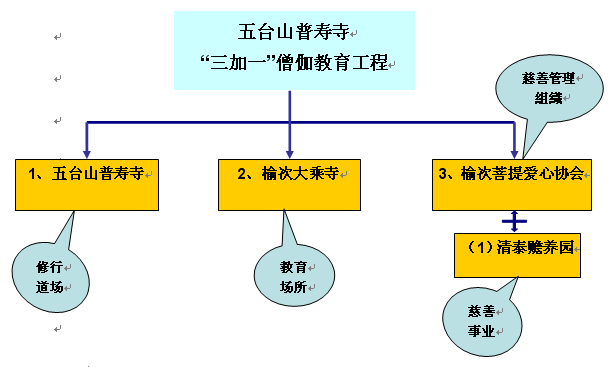 20年中,不断地深入体悟佛陀出世慈悲利生的旨趣,认真领会祖师们对僧教育的真知灼见,缅怀前辈承办僧教育的不朽贡献,思考专家学者对僧教育的精辟评点,试探性地规划了五台山普寿寺尼僧教育的总体框架:即“三加一”僧伽教育工程模式。此中的“三”是指三个机构:五台山普寿寺——修行道场;榆次大乘寺——教育场所;菩提爱心协会——慈善机构。其中的“一”是指菩提爱心协会承办的旨在济助孤寡老人弱势群体的一项慈善事业——清泰赡养园。