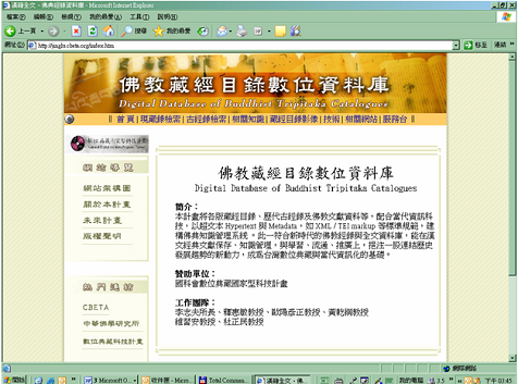 中华电子佛典协会CBETA自1998年2月15日起开始《大正新修大藏经》(以下简称《大正藏》) 电子化作业,当年年底发表《大正藏》第5册至第10册网络版与光盘版。嗣后再 经一年多时间完成汉译佛典“经、律、论”计32册6000万字作业,于1999年12月发行《大正藏》第1册至第32册。同年,CBETA 亦完成建立电子数据库的“标准化”、“国际化”作业规范。此项作业奠定了国际间汉文电子文献制作的规范。
