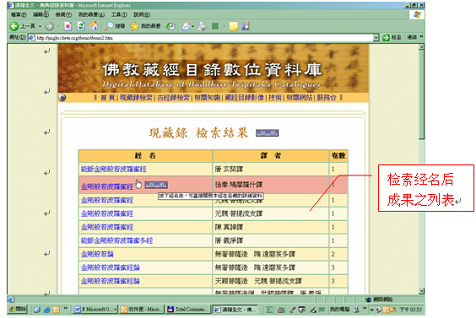 In conclusion, base on the Digital database created by CBETA, this project provides a friendly interactive way of doing 'content markup' of documents by linking the Tripitaka Catalogs to the designated text string, then to generic knowledge structures of the Sūtra. The original document and its outlines as the generic knowledge structure to illustrate the techniques of representing various versions, providing matching, browsing, and retrieving of ancient documents. Then through the cooperation and collaboration of various areas to establish the Integrated Buddhist Archives network – in the Information ear to build a new Digital Buddhist Full text database to serve scholars worldwide.