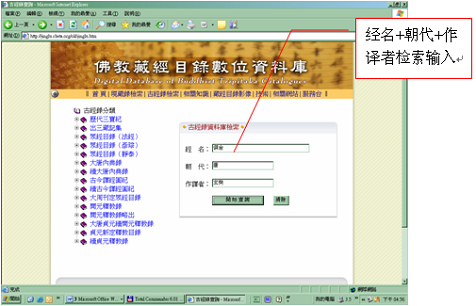 首先于网页上方设立九项功能选单,即是本网站的主要功能。其中现藏录经录数据库检索及古经录数据库检索,提供强大功能检索即是本网站之特色。现藏录经录检索页,主要是经名与作译者功能检索,亦可二者合并检索。