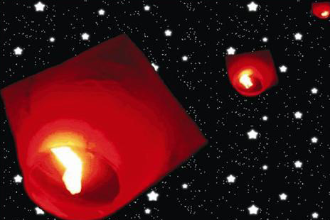 放飞孔明灯时,先在地上生起一堆柴草,几个人同时扶起孔明灯,摆到火堆之上。那样,柴草燃烧产生的大量热气,很快就会使瘪着的灯体鼓胀起来。这时将一团泡足煤油的棉絮放入网兜点燃,在柴火和煤油火的同时作用下,孔明灯则形成一股很强的向上的力量,于是扶灯人一齐放手,孔明灯就迅速起飞,犹如放飞的大气球,很快便升上高空,在夜空中飘游远去……这时候,灯体已经看不见,只见那团熊熊燃烧的灯火,仿佛一颗流动的火星,但比火星更明亮更灿烂。