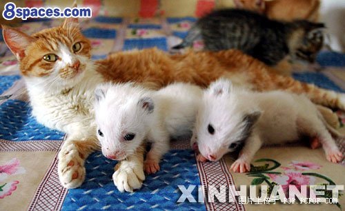 7月4日,在黑龙江省穆棱市河西乡韩女士家中,两只小白狐在家猫“妈妈”身边玩耍。据介绍,这两只小白狐是韩女士家的一只母猫在六月初突然叼回家中的,其后,母猫一直尽职尽责地喂养它们。