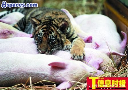 记者了解到,三只小老虎是孟加拉虎,他们的妈妈是第一次生虎仔,由于没有经验,小虎生下来后不久就被虎妈妈遗弃,三只小虎饿得嗷嗷直叫。心急如焚的饲养员想了很多办法,包括人工饲养,但小虎都不太接受,连续几天下来,小虎饿得只剩下皮包骨。最后,饲养员灵机一动:“今年刚好是猪年,我们何不领一头猪过来,看看它能不能喂养小虎?”于是,饲养员买了一头刚刚产下小猪的老母猪,一会来小虎就爬到猪妈妈的身上吸奶,而猪妈妈也没有任何的反抗行为,欣然接受三个“虎儿子”。