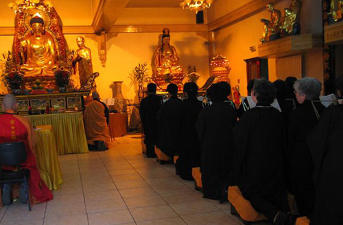 图:虔诚的佛教徒在巴黎的潮州佛堂做法事