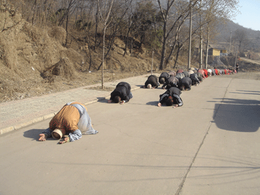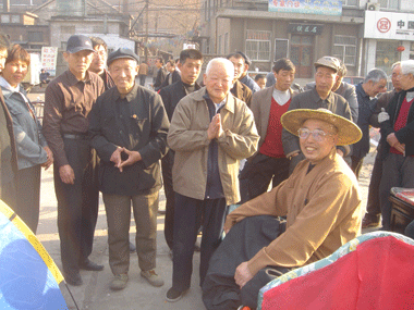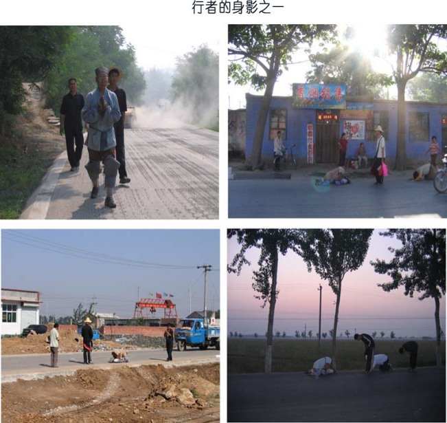 尤可赞叹者,是三位护法师兄。他们此番行程所面临的考验不仅是体力、毅力、耐力、魄力,更是心力、忍力、信力和愿力。东营的李兆丰师兄年纪稍大,深圳的杨国师兄、淄博的李军师兄都二十来岁,书生年少,胆识过人。杨国师兄来自深圳某大公司,此次发心苦行,登三轮自行车,驮运日用资量;师兄体力单薄,戴近视眼镜,但吃苦耐劳,无怨无悔。两位李师兄则如护法金刚,时刻伴随师父左右;师父叩拜之际,他们和掌深鞠躬,如法如律。面对过往行人的复杂目光,师兄们熟视无睹,神不旁骛,坦然镇定,令人敬佩。