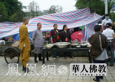 佛教寺院第一时间在绵阳九洲体育馆灾民救济中心、南河体育中心灾民救济中心为灾民送上了第一碗热粥;