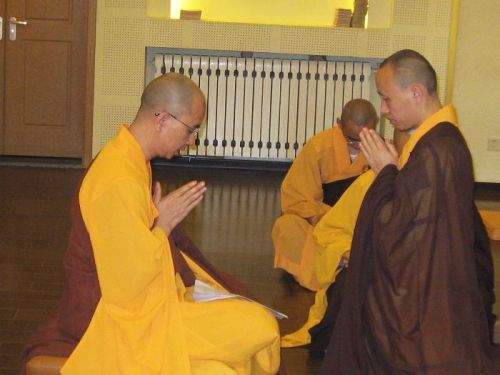 新戒回来,第一件事情就是学习戒律。《华严经》中说:“戒为无上菩提本,长养一切诸善根”。师父4月23日去为这次香港西方寺的戒子们授比丘戒时,在推客上专门提到戒律的殊胜说:“世间所有诸花果,乃至沈檀龙麝香,如是等香非遍闻,唯闻戒香遍一切;旃檀郁金与苏合,优钵罗并摩隶花,如是诸妙花香中,唯有戒香而最上;所有世间沈檀等,其香微少非遍闻;若人持佛净戒香,诸天普闻皆爱敬。如是具足清净戒,乃至常行诸善法,是人能解世间缚,所有诸魔常远离。”虽然如此,但律相繁杂,同时戒律的精神很不容易把握,所以很多人对戒律要么束之高阁,要么偏于极端,没能将定慧之基的律学得到很好的学习和领纳,不能不说是一件很遗憾的事情。为此,我们专门就大众容易碰到的戒律方面的问题,新戒学戒的次序以及广大的居士如何学戒等问题请教了龙泉寺的贤甲法师。法师很慈悲,对戒律比较了解,将律宗最重要的著作——南山三大部基本研阅完毕,很多戒律的开遮比较善巧,师父也肯定他。