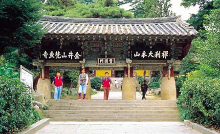笔者2003年到韩国,去的次数最多的是位于釜山市金井山、有“禅刹大本山”之称的梵鱼寺。当年6月,由于工作紧张,身心疲惫,学生小黄建议我到不远的梵鱼寺转转,他陪同。先乘地铁,再转公共汽车,下了车向前走,曲径通幽,转来转去,不知寺院还有多远。正狐疑间,一拐弯,梵鱼寺的“一柱门”突现在眼前。门上中间高悬“曹溪门”的匾额,左右两边的侧间上悬挂着“金井山梵鱼寺”和“禅刹大本山”的牌匾,梵鱼寺到了。当日小雨绵绵,山水淙淙,虽值盛夏,但凉爽宜人。周围草木葱茏,山间云雾缭绕,更增添了几分肃穆与神秘。