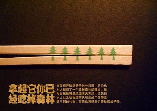 在中国大多数的餐馆,无论档次高低,一次性筷子早已成了必不可少的餐具。随著经济发展,国内流动人口增加,中国从上个世纪八十年代开始推广使用一次性卫生筷子,以提高公共就餐卫生水平,预防疾病传播。虽然不知道这项公共政策为大众健康方面带来了多少好处(“卫生”筷子并不卫生的新闻已屡见不鲜),但毫无疑问的是一次性筷子对环境的破坏。