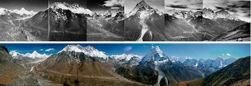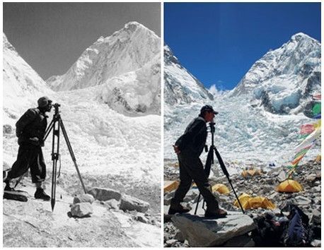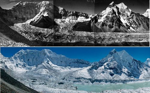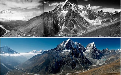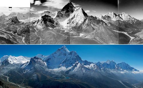 瑞士冰河学家Fritz Müller和澳大利亚科学家Erwin Schneider是最先对喜马拉雅山展开研究的先驱学者。二十世纪五十年代,他们克服了冰暴、高空病和雪盲症,给喜马拉雅山的冰河和山脉绘图、测量和拍照。半个世纪过去了,美国地理学家Alton Byers重返当年拍照地点,严格按照前辈的角度再次对喜马拉雅山拍照。他将新老照片并列放置进行比较,发现短短五十多年间,气候变化给喜马拉雅山带来的改变是如此显著,令人震惊。Fritz Müller和澳大利亚科学家Erwin Schneider在对喜马拉雅进行初探时,绝不会预见到有些拥有几千年历史的巨大流动冰体50年后会缩小到只有湖泊那么大。这组主题为“喜马拉雅――景观变迁启示录”的图片在德国波恩举行的全球气候变化峰会上展出,引起各国对冰川消融问题的讨论和重视。