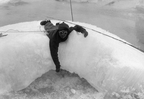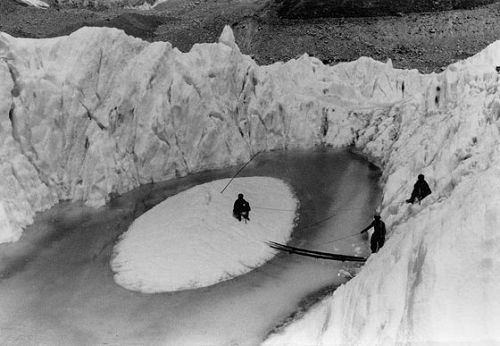 探险队的三名成员站在冰塔上观察冰层。英语中的冰塔(serac)一词来源于法语‘sérac’,指一种白色酥脆的奶酪。冰塔是冰川表面林立的塔形冰柱。因冰川表面长时期发生差别消融所成。高达数十米,形态各异,多呈塔状,一座座耸立在冰面上,故称冰塔。冰塔通常体积庞大,一旦温度上升,极易崩塌。